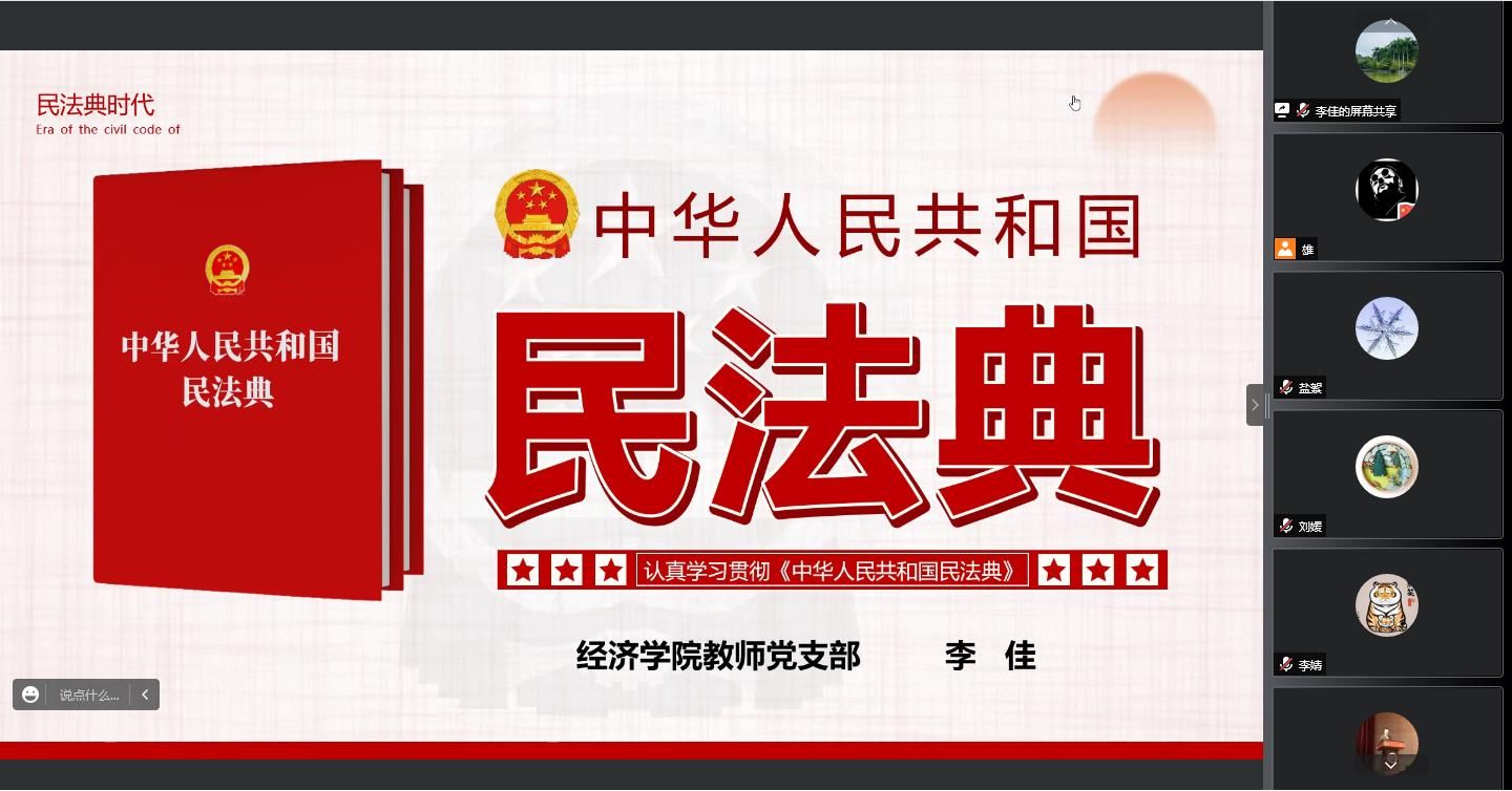 为深入学习贯彻落实习近平法治思想,特别是习近平总书记关于加强民法典学习宣传的重要指示精神,让民法典走到群众身边、走进群众心里。6月24日下午,经济学院教师党支部通过线上会议的方式,就《中华人民共和国民法典》进行普法宣传教育。本次由教师党支部书记张晓林同志主持,教师党支部组宣委员李佳同志主讲,学院全体教职工参加了学习。