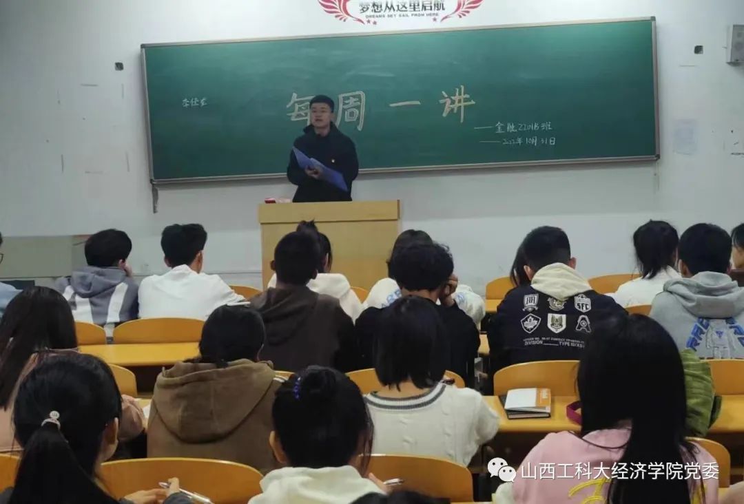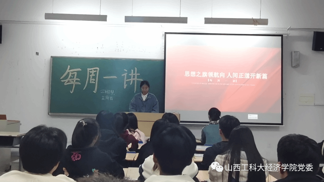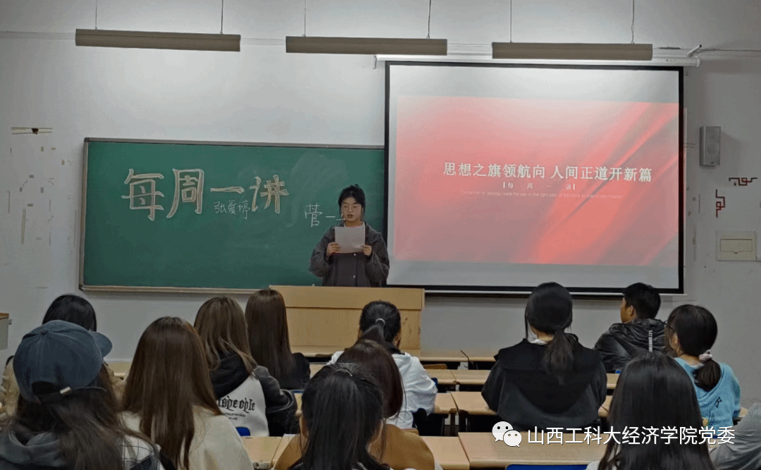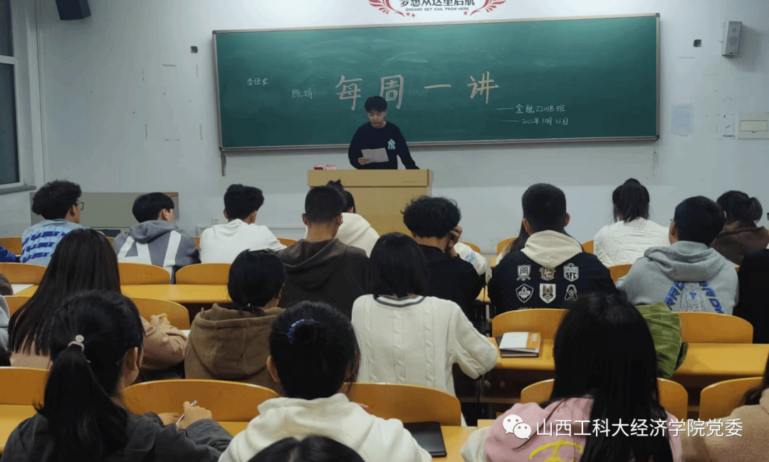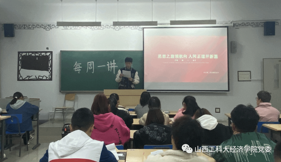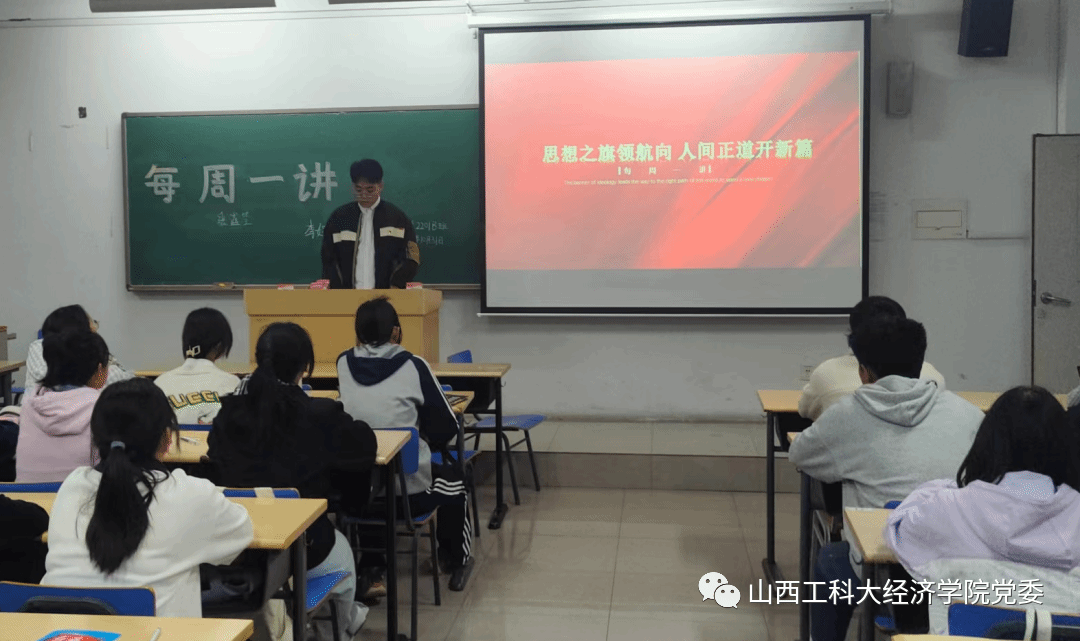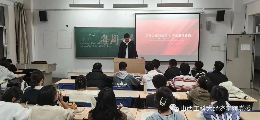 党的二十大报告让广大中国青年看到,伟大的新征程已经开始,奋进正当时。为了让同学们更加坚定不移听党话、跟党走,怀抱梦想又脚踏实地,敢想敢为又善作善成,立志做有理想、敢担当、能吃苦、肯奋斗的新时代好青年,经济学院于2022年10月31日开设了主题为“思想之旗领航向,人间正道开新篇”的每周一讲宣讲活动。